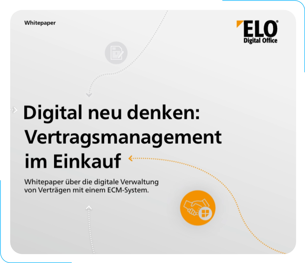 Unser Whitepaper „Digitales Vertragsmanagement im Einkauf“ bietet Ihnen detaillierte Einblicke in die Möglichkeiten der digitalen Vertragsverwaltung mit einem ELO-ECM-System. Erfahren Sie, wie das digitale Vertragsmanagementsystem Ihre Geschäftsprozesse sicherer gestaltet, beschleunigt und alle gesetzlichen Richtlinien erfüllt.